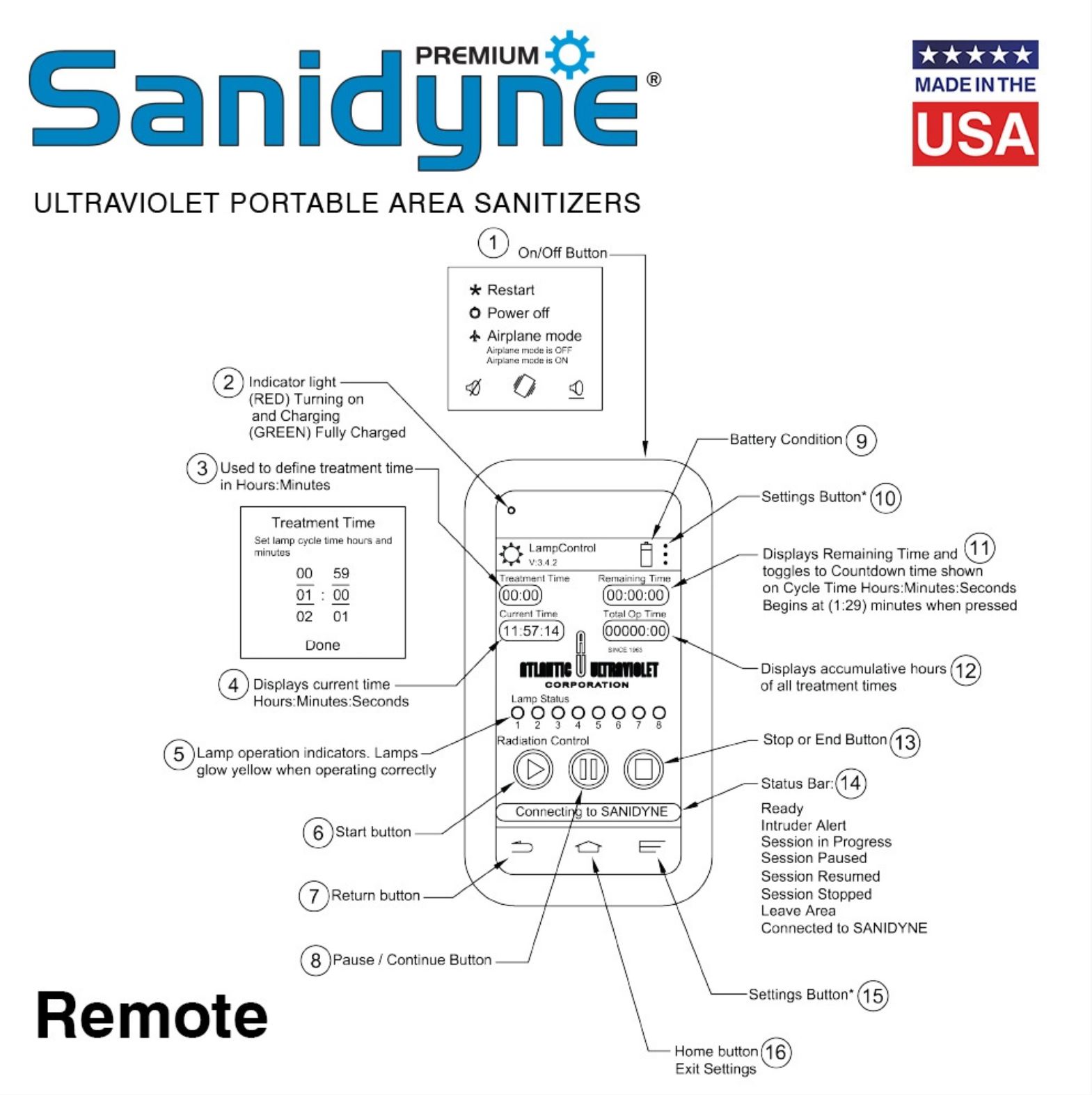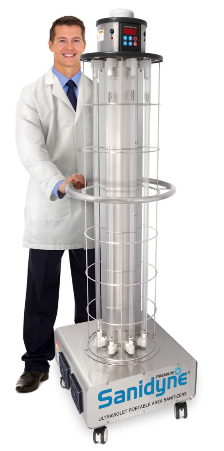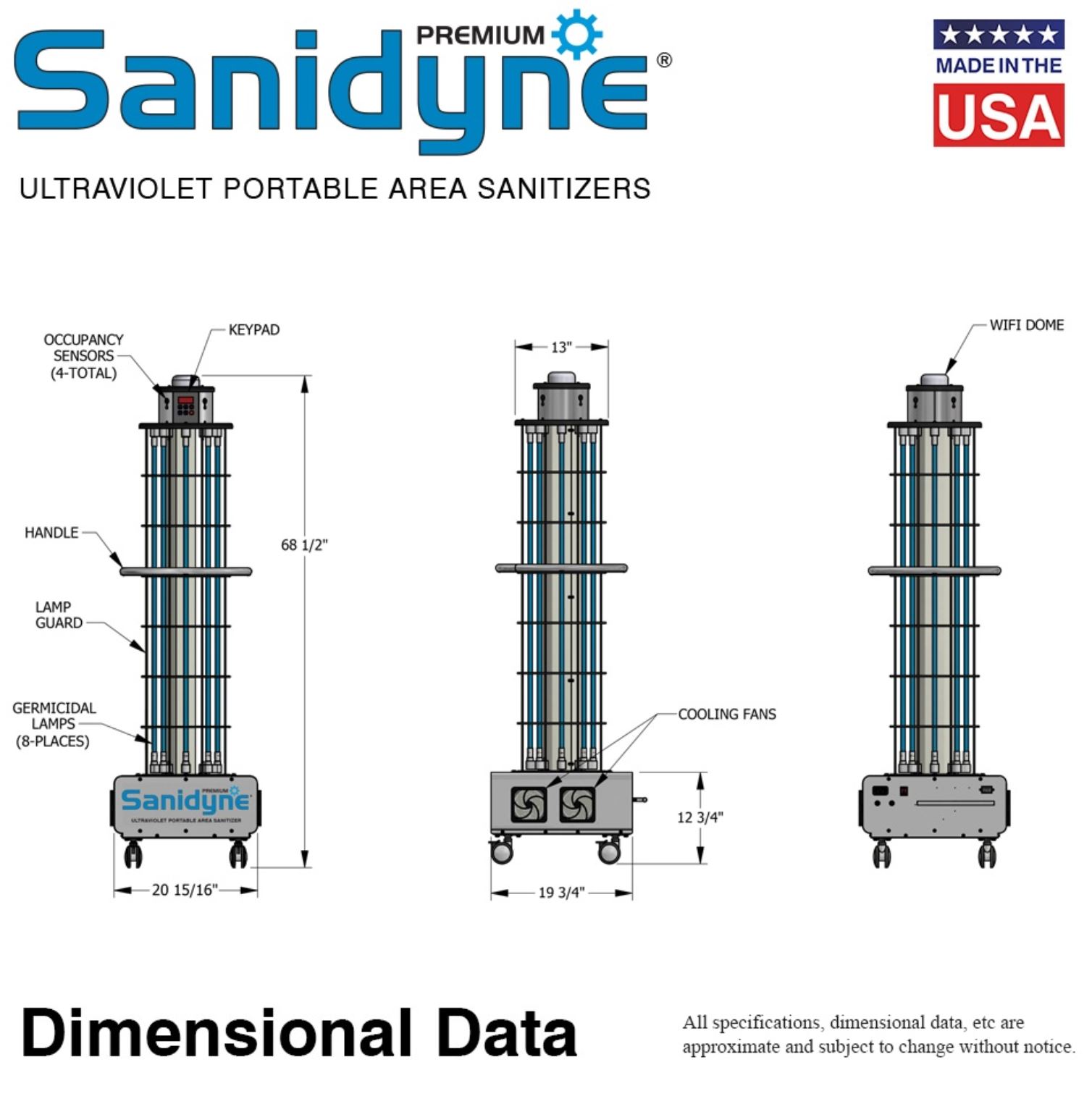 The Atlantic UV Corporation has been providing top-rated UV sanitizers since 1963, and Sanidyne Premium Portable UV Air and Surface Sanitizer System is their top of the line portable large room UV sanitizer. The Sanidyne Premium ultraviolet light bulb disinfection system was carefully conceived to provide germicidal disinfection to purify the room air and exposed surfaces of an unoccupied area by the means of 8 STER-L-RAY amalgam antibacterial, antiviral and antimicrobial ultraviolet Lamps, sanitizing 3500 square feet in as little as 15 minutes, with no after treatment wait time for re-entry! Got a larger space? No problem–just move the unit every 15 minutes to the next 3500 square foot area. These special lamps generate high levels of germicidal ultraviolet radiation lethal to infectious microorganisms such as bacteria, mold, and viruses like HIV, Flu Virus, and Corona Virus. The Sanidyne Plus saves a tremendous amount of time and money compared to using spray and fogging disinfection systems which require regular purchase of expensive disinfectant solutions and long after treatment wait times before a room is ready for re-entry. For a medical, manufacturing or any business facility with multiple rooms to disinfect on a daily basis, this time and cost savings can be a huge benefit.