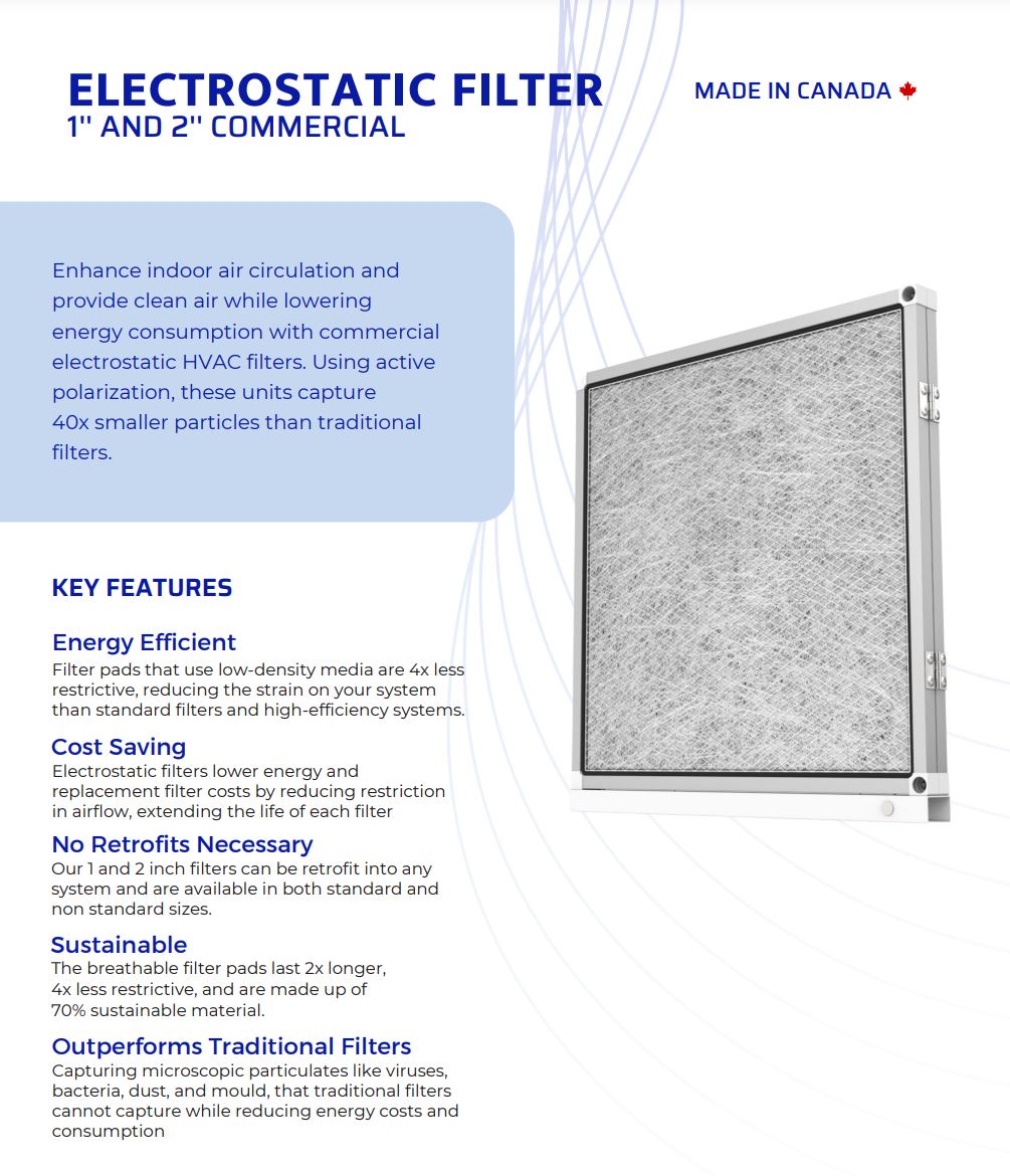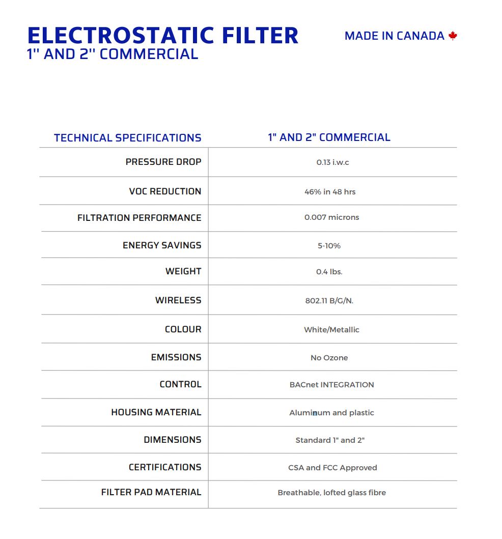 The BLADE PRO ESF-1 Electrostatic HVAC Filter is a 1 inch thick advanced air cleaning filter upgrade that removes dust, and particles as well as reduces fumes and odors. This air purifying filter is designed as the best option in HVAC systems and buildings where enhanced air quality is required, but a HEPA filter is not practical. Electrostatic air cleaning filters remove harmful microparticulates that traditional filters do not, making them the ideal filtration solution for businesses, providing maximum removal of harmful particles while drastically reducing the cost of replacement filters. Using active polarization, Blade ESF electrostatic HVAC filters provide an enhanced MERV 13 level filtration rate while also removing particles as small as .007 microns–40x smaller particles than traditional HVAC filters. BLADE Air Purifying ESF even reduces VOC concentrations including smoke and odor by 46% in 48 hours. This produces a massive reduction in harmful indoor air contaminants and greatly improved indoor air quality in a building or school in a matter of hours.