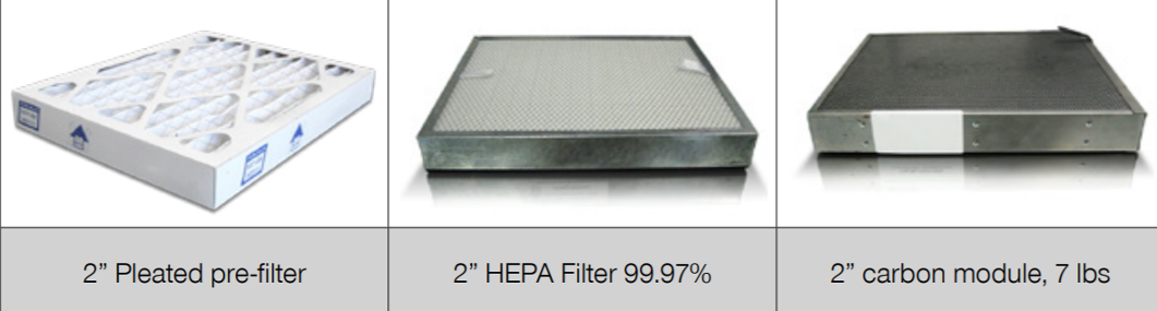 - Multi-stage filtration system: pre-filter, HEPA and carbon chemical filter