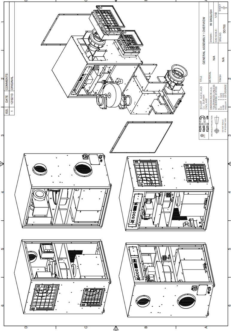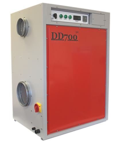 Air (Process Air) is drawn into the top-rated and powerful DD700 dehumidifier machine, where is passes over a wheel impregnated with industrial grade Silica Gel. As the air passes over this wheel, any moisture present in the air is absorbed into the Silica Gel wheel before leaving the dehumidifier as warm dry air. The Silica Gel wheel is continually, slowly rotating, typically at three revolutions per hour. As the wheel rotates, a small portion passes through the regeneration segment. During this phase a second air stream (Regeneration Air) is heated to a high temperature before passing over the wheel. Any moisture present in the wheel is released into this air stream; this hot wet air is then exhausted outside the area being dried..