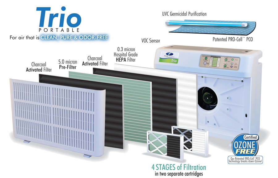 The Trio-1000P portable indoor air purification system provides high volume germicidal ultraviolet light, HEPA & natural charcoal filtration, eliminating cat, dog & other animal smells, cigarette smoke, mold, dust mites, particles & chemicals, sanitizing homes, bedrooms & musty basements better than many other top-rated air scrubbers for sale.  Bacteria, viruses, germs, mildew, mold, and fungi are neutralized or inactivated by a high output UVC germicidal lamp with 150 times the UV intensity of the sun. Fresh air exits the Field Controls Trio-1000P air sanitizer after it passes through a full 722 square inches of Titanium infused PRO-Cell™ . This patented PRO-Cell™ Technology transforms odors, smoke, and volatile organic compounds (VOCs) into fresh healthy air.