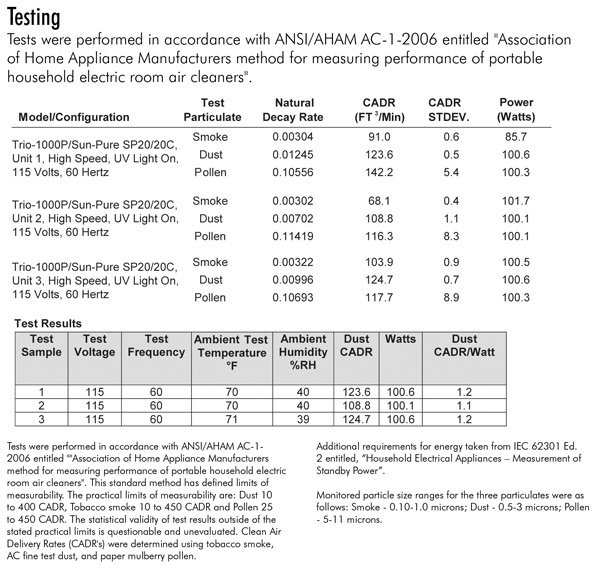 The Field Controls TRIO Portable Air Purifier provides four stages of filtration to ensure that your air is clean. The pre-filter collects particles as small as 5.0 microns*, while two layers of charcoal activated filters remove fumes and VOCs including odors and smoke. The final stage of filtration is a hospital-grade real HEPA filter that traps 99.97% of tiny microscopic particles as small as 0.3 microns such as dust, dander, hair and pollen.  This powerful system allows you to remove smoke, odor, pet hair, litter dust & dander from large rooms and offices and feel confident that you’re using one of the best allergy and asthma reducing portable electronic air purifiers on the market.  Take a look at the performance data below: