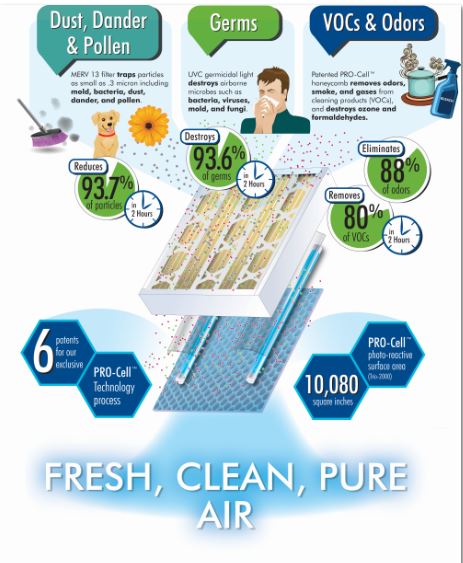 The TRIO-16 and TRIO-20 induct dust collecting, fume extracting and germ, bacteria, virus, mildew and mold eliminating air purification systems keeps air in the home fresh, clean, and pure. As air enters the top rated whole home air sanitizing TRIO air cleaner, it is filtered with a MERV 13 dust removing media air filter cartridge. This pleated 4-inch filter traps particles as small as .3 micron including mold, bacteria, dust, dander, and pollen. After the filter, the air passes through the antimicrobial, antiviral and antibacterial UV-C germicidal lamp. This treatment zone is powered by two high-efficiency 24-inch UVC germicidal lamps that reduce airborne germs, bacteria, viruses, mold, and fungi. The final phase uses patented PRO-Cell technology, our exclusive Photo-Reactive Oxidation process. When the patented titanium dioxide coated catalytic aluminum substrate is exposed to the UV air sanitizing light bulb, the PRO-Cell’s extensive surface area transforms odors and VOCs into harmless, odorless water vapor and carbon dioxide.