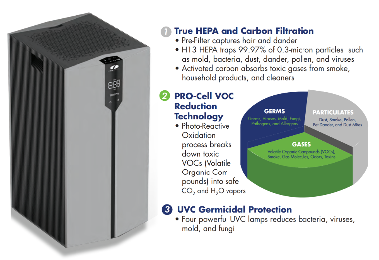 - Patented PRO‐Cell PCO Technology ‐ Photo‐Reactive / Catalytic Oxidation breaks down toxic VOCs (Volatile Organic