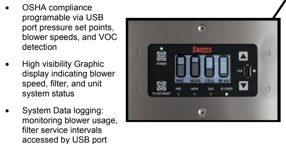 • Standard Filter Set: 9” Pre-Filter: MERV 11 99.999% at 1 micron, 4” – HEPA Filter: 99.97% @ 0.3 micron, 4” –  30 lb Gas / Odor filter
