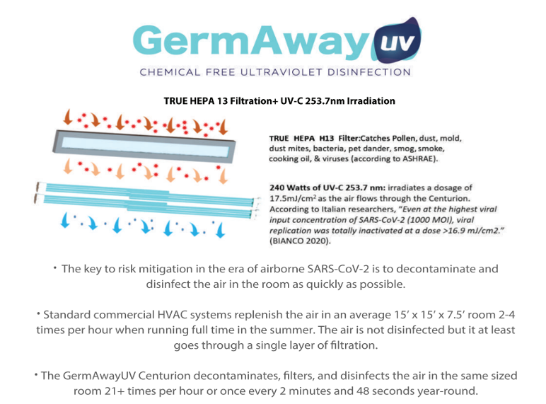 It has been long known that UVC provides germicidal irradiation and fully degenerates the DNA of many microbes or pollutants. This is the part of the filtration process that most noticeably eliminates the microscopic bacteria and viruses that tend to spread in areas with high occupancy. There are now studies which have been done on the effect of UVC on the germ which causes C-19, and these can be found in the links below. It is also effective against many other airborne germs and pathogens. You will be pleased to know that the stylish, ebony chrome finished, aluminum case, does not allow the UVC to be seen from the outside, keeping the occupants in the room safe.