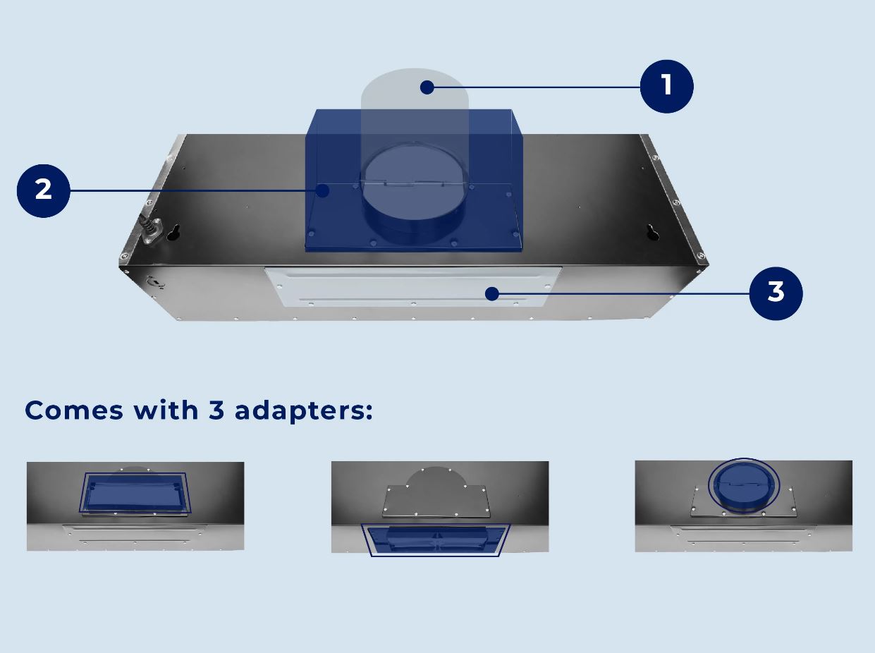 With the recessed low profile design, you won’t even know the UC-B018 under cabinet vent fan is there – until you turn it on and watch as the 600 CFM exhaust fan sucks away the cooking fumes, smoke, and odors fast. The bright LED light strip with GU10 bulbs inside conserves energy without compromising on light. The GU10 bulbs can be found in any local hardware store, so you can change the light color to coordinate with your kitchen. You can easily control the noise of the range hood’s vent fan and power with three-speed settings, and easily convert this cooktop canopy for a ductless recirculation air setting–something most under cabinet kitchen exhaust systems can’t do! Modern easy clean dishwasher safe stainless steel metal baffle filters are included, too. And, the UC-B018 convertible cooktop ventilation hood comes with 3 exhaust adapters to make installation simple and fast, regardless of which type of venting you choose.