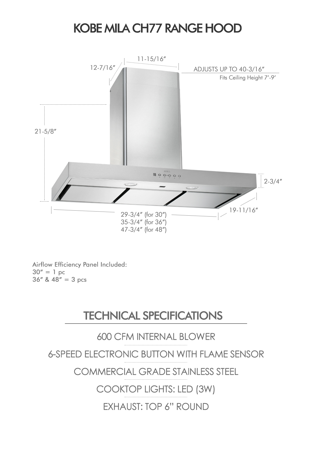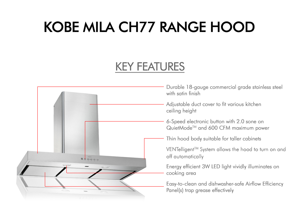 With top-quality stainless steel construction, high quality, long lasting components, powerful yet quiet 600 CFM airflow, cleanable metal baffle filters, 2 year parts and labor warranty and an affordable price, the low-profile KOBE Mila Premium CH77 Series 48 inch Ducted Wall Mount Kitchen Exhaust Canopy is one of the best residential kitchen hood system values  available today. Order your premium 48″ ducted wall mount stainless steel range hood from our top-rated and affordable kitchen ventilation supply store at the best possible cheap discount online sales price with free shipping. If you have questions or would like to discuss multiple unit purchases for contractors or construction, etc, give us a call toll free at 800-701-2513 and we’ll be happy to assist.