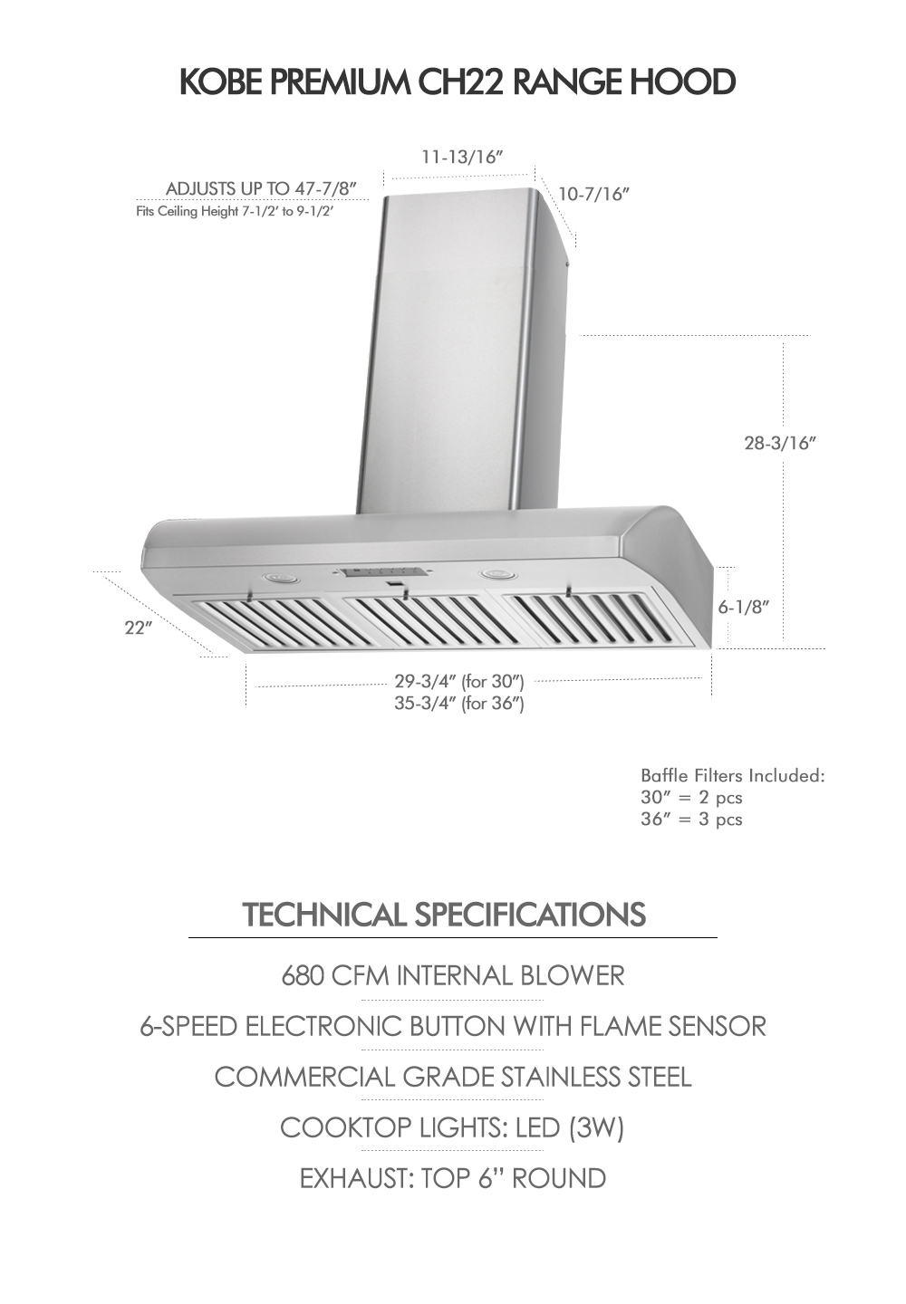 With top-quality stainless steel construction, high quality, long lasting components, powerful yet quiet 680 CFM airflow, cleanable/reusable metal baffle filters, 2 year parts and labor warranty and an affordable price, the modern low profile KOBE Premium CH22 Series Wall Mount 30 inch vented Range Hood is one of the best ducted residential kitchen ventilation systems available today. Order your exhausted cooktop vent hoot from our top-rated and affordable kitchen hood store, at the best possible cheap discount online sales price with free shipping. If you have questions or would like to discuss a wholesale quote for bulk multiple unit purchases for commercial contractors, homebuilders or construction companies, etc, give us a call toll free at 800-701-2513 and we’ll be happy to assist.