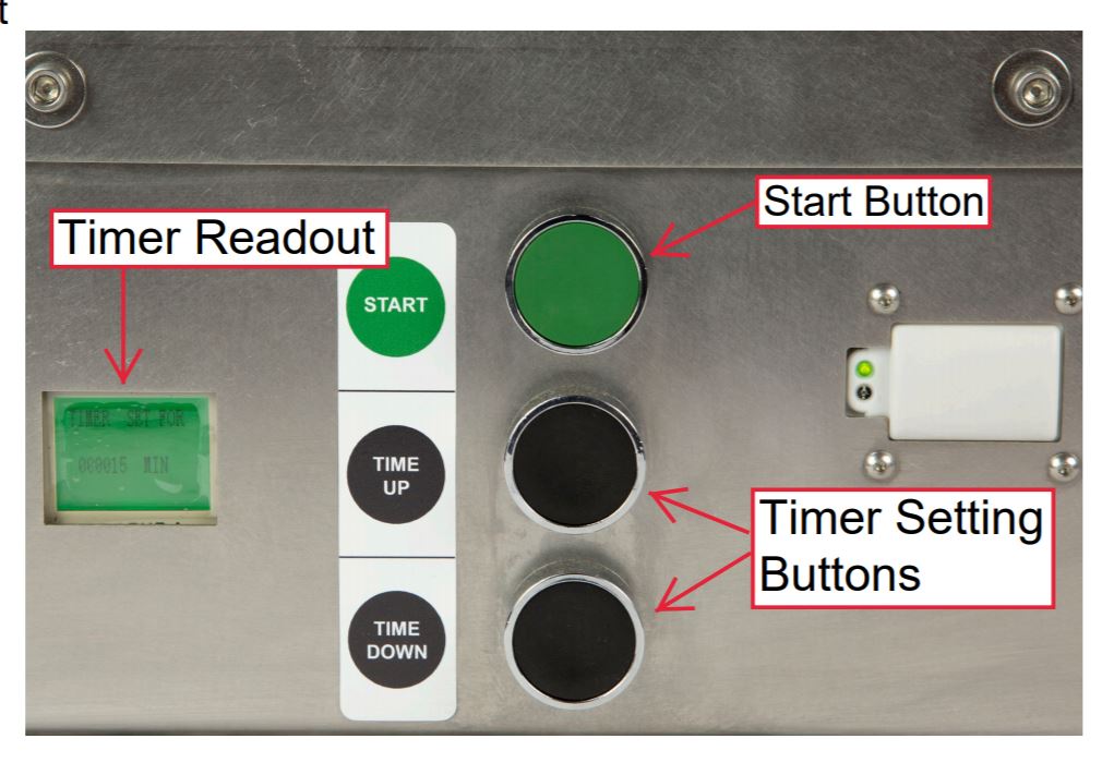 At start up, there is a built-in 1-minute and 30-second delay to allow individuals to safely leave the room after deploying the device. An accessible digital timer enables operators to set exposure times. The lights will automatically turn off when the set time is complete. Operators may adjust settings via a controller at the bottom of the unit. Two warning signs and a pair of safety glasses are included with the device.