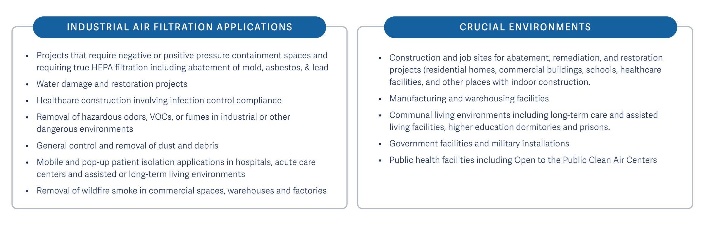 - BEST FOR: Projects that require negative or positive pressure containment spaces and requiring true HEPA filtration including abatement of mold, asbestos, & lead, construction job sites, manufacturing as well as removal of wildfire smoke in commercial spaces, warehouses and factories. Great for hospitals, healthcare and other applications requiring a unit with sealed corrosion resistant surfaces.