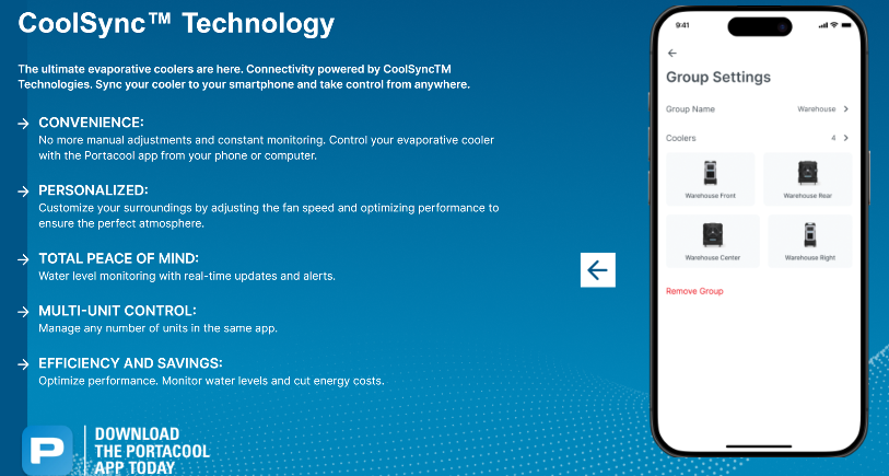 • Connectivity: Powered by Portacool CoolSync™ Technology with Wi-Fi capability, controlling cooling of multiple units from anywhere!