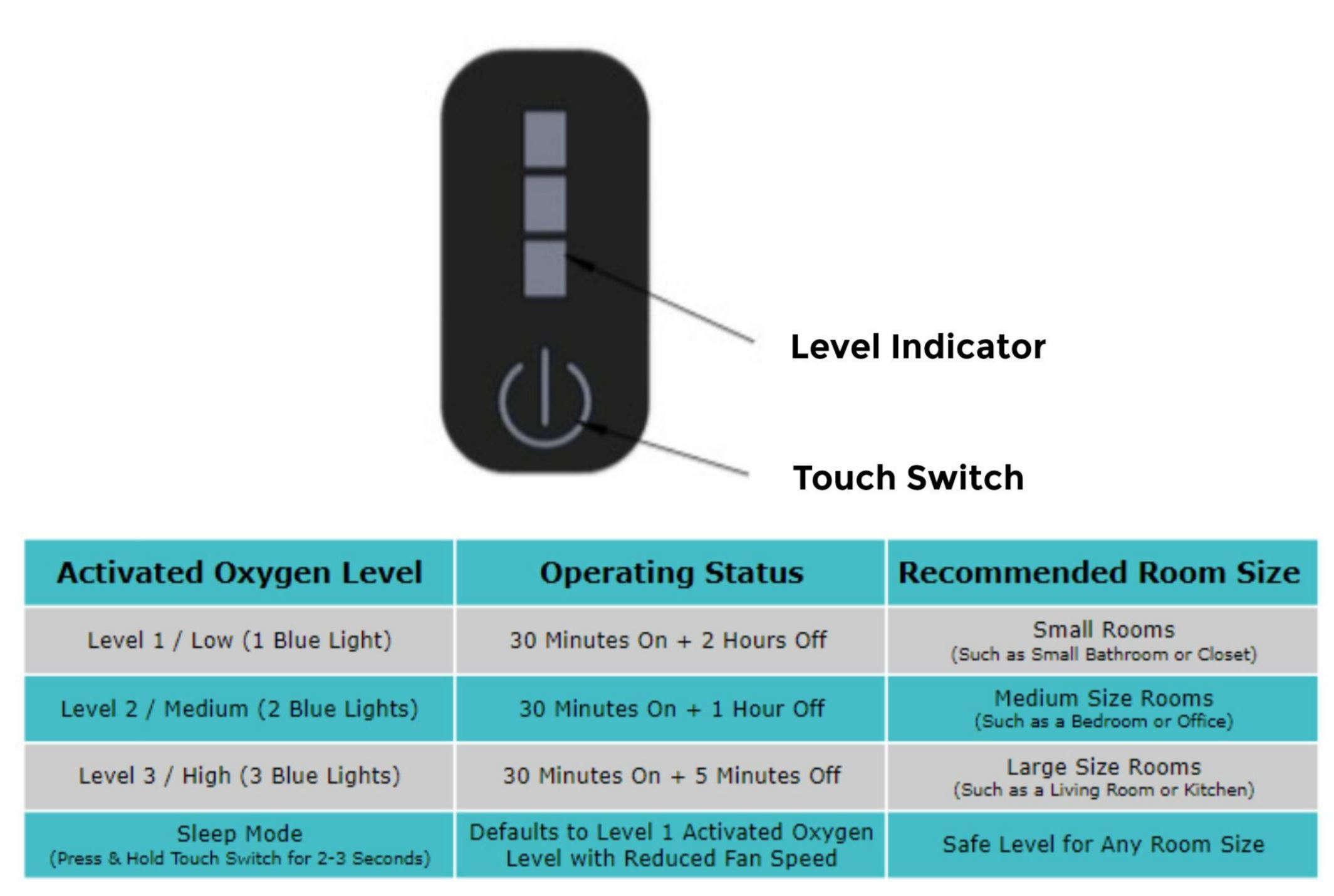 - Activated Oxygen Control & Timer, On / Off, 30 min, 1 hour, 2 hours