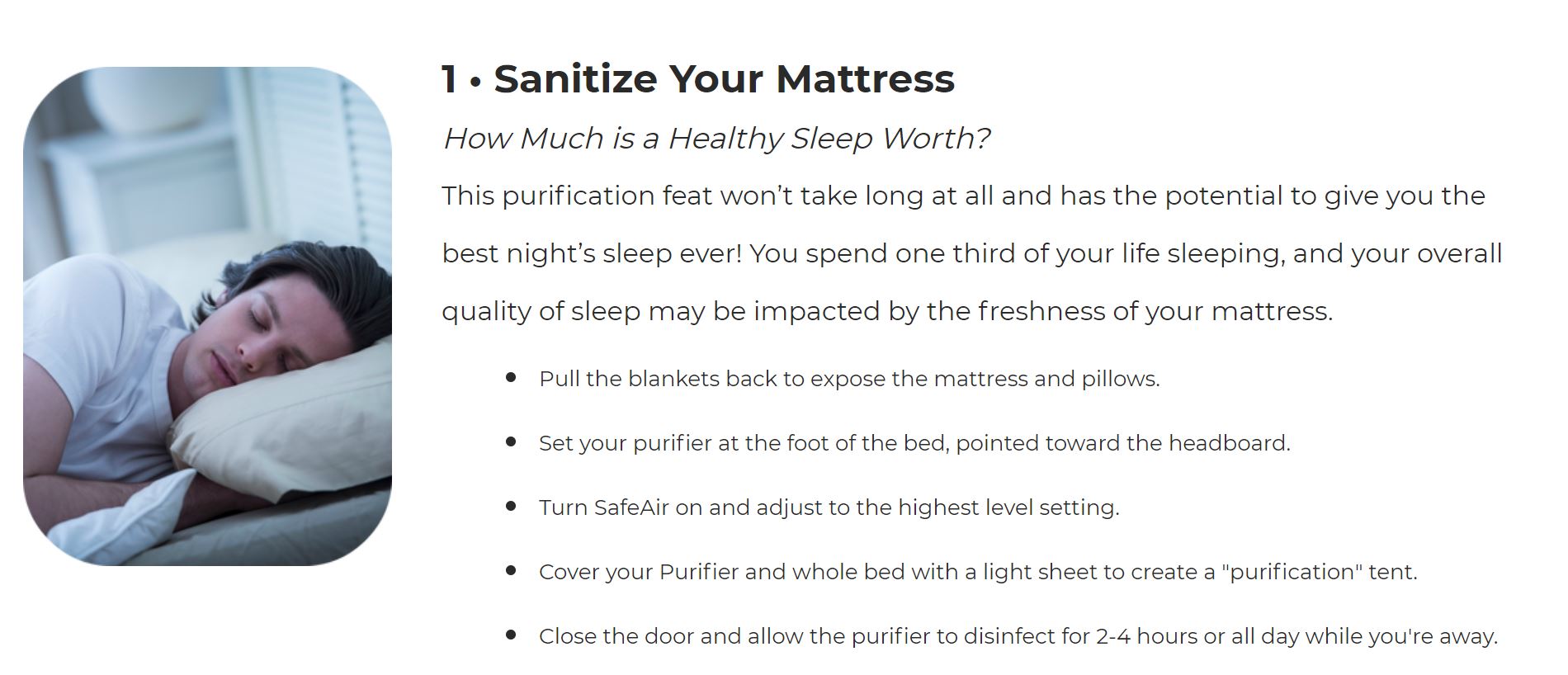 - Sanitize Your Mattress – overall quality of sleep can be impacted by the freshness of your mattress.