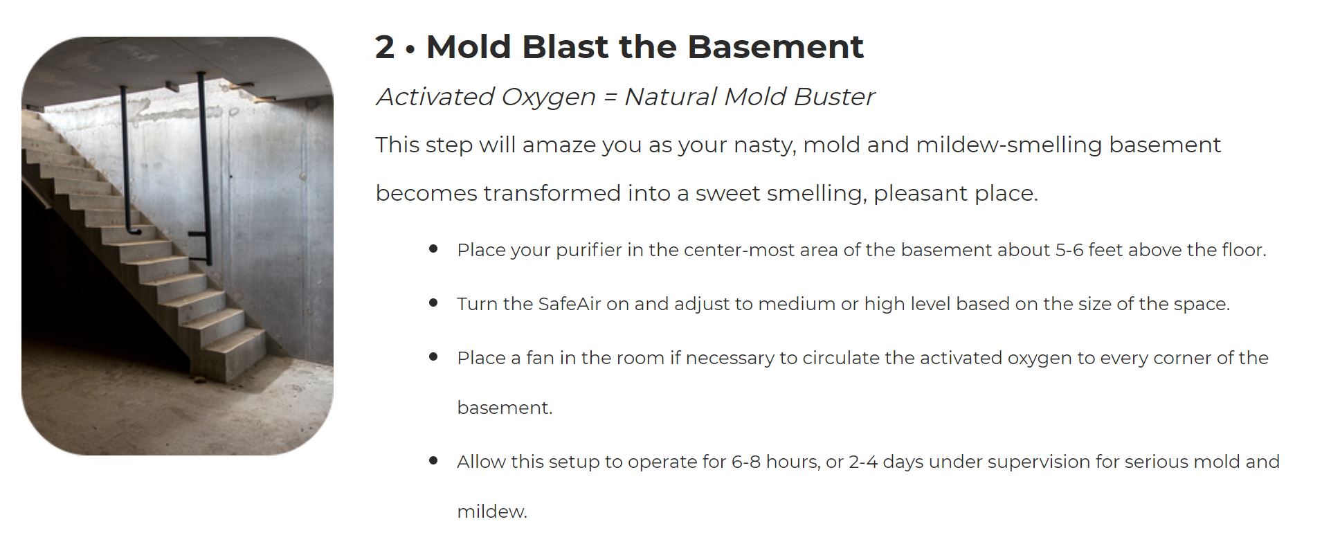 - Mold Blast the Basement – Activated Oxygen = Natural Mold Buster.
