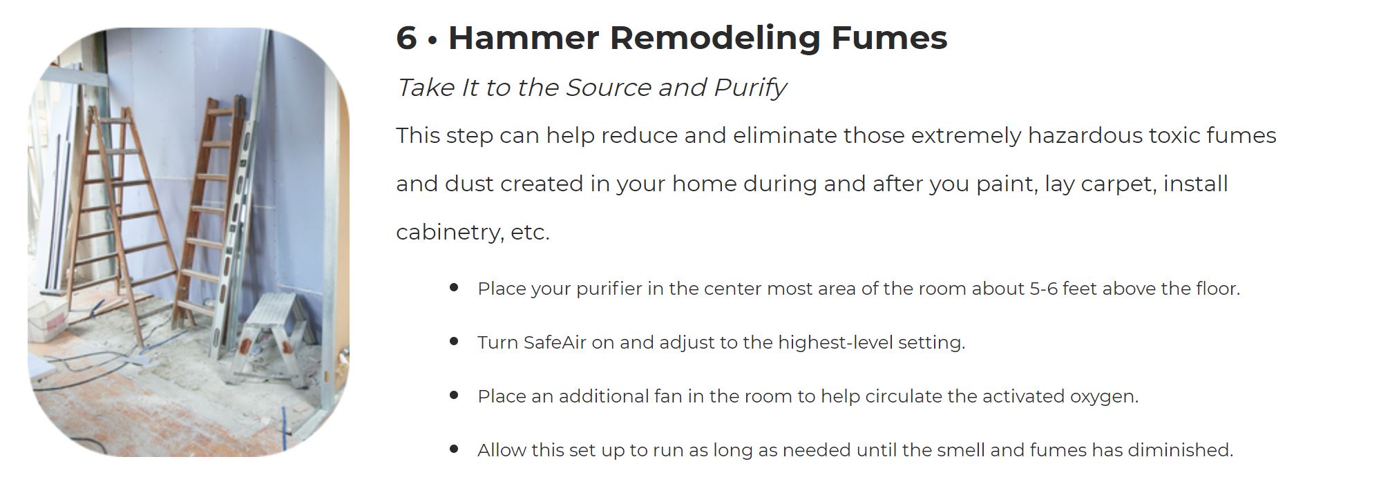 - Knock Out Remodeling Fumes – quickly reduce and eliminate those extremely hazardous toxic fumes and dust created in your home during and after you paint, lay carpet, install cabinetry, etc.