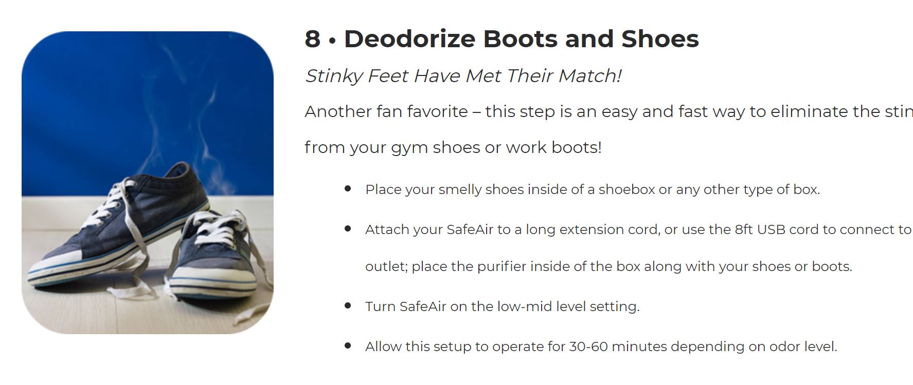 - Deodorize and Disinfect Boots and Shoes – Stinky Feet Have Met Their Match!
