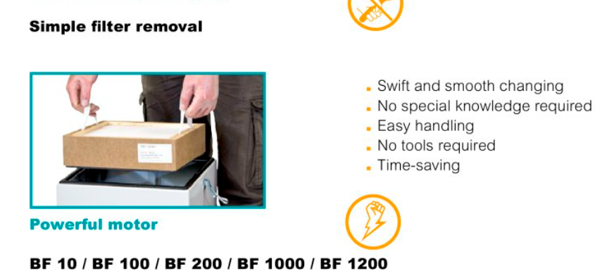 The free standing BF10 is an entry-level model for flue gas filtration and extraction that offers a compact and mobile solution for one to two workstations. There are four main configurations, each tailored to specific filtration requirements in a space-saving design. Each unit features a differential pressure indicator to monitor filter saturation and an energy-efficient blower for high vacuum performance with minimal energy consumption. The BF 10 fume eater and dust extractor uses dual adsorption technology with activated carbon and granules to ensure comprehensive air purification. The system efficiently removes contaminants with advanced features such as dust separation, molecular filter for gaseous contaminants and various extraction options. Changing filters is simple and requires no tools or expertise. The compact and portable BF10 workshop air cleaner can be controlled externally and has a “filter full” warning at 75% to improve system management and ensure the HEPA and carbon filters are not overly saturated.